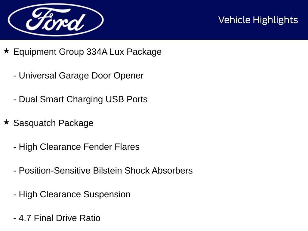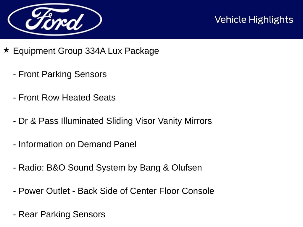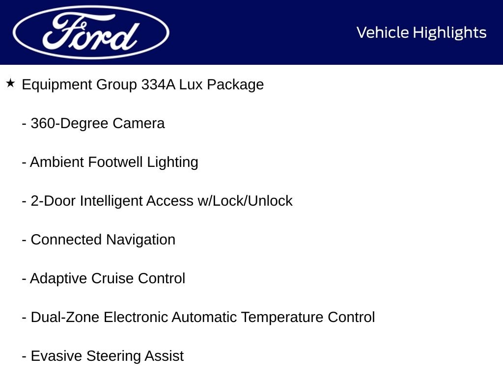 ⢠EQUIPMENT GROUP 334A LUX PACKAGE: Heated Steering Wheel, Rear Parking Sensors, Power Outlet, Illuminated Visor Mirrors, Evasive Steering Assist, Dual-Zone Climate Control, Ford Co-Pilot360, Auto High-Beam Headlamps, Blind Spot Monitoring, Rear View Camera, Lane-Keeping System